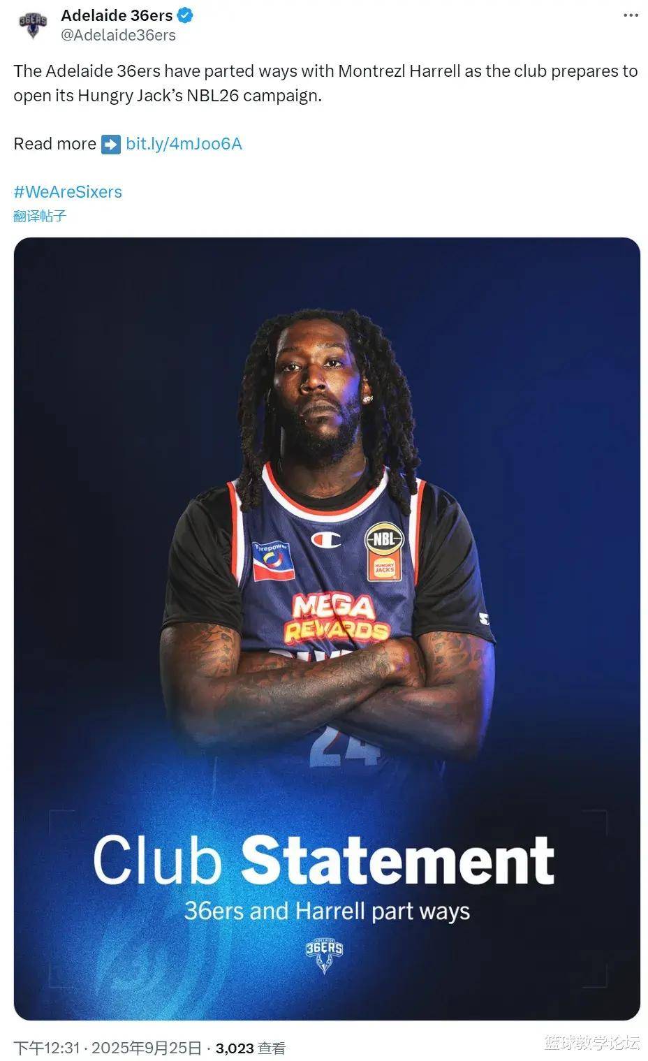 2025-09-28CBA,中国男子篮球职业联赛,CBA赛程,CBA直播,CBA比分,CBA投注/提供CBA最新赛程、实时比分、球队阵容、球员数据及盘口分析,服务中文球迷与篮球数据爱好者,让你全面掌握CBA最新动态。北京时间9月25日下午,澳大利亚NBL联赛传来重磅消息——阿德莱德36人队官方宣布与NBA前最佳第六人蒙特雷斯·哈雷尔提前解约。据澳洲知名篮球记者Olgun Uluc透露,这位29岁的前锋将转战波多黎各联赛,该联赛不受国际篮联(FIBA)的管辖。
