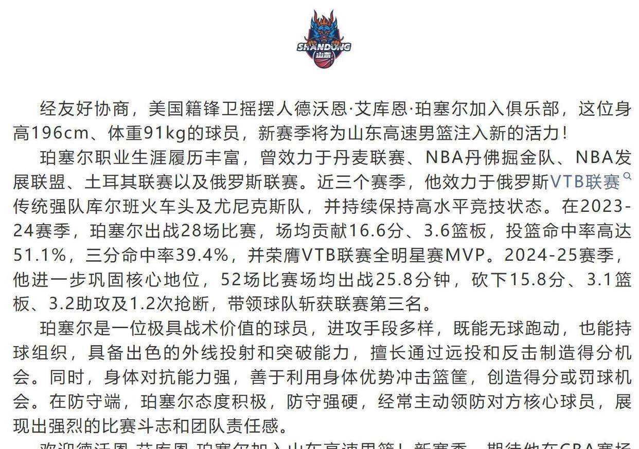珀塞尔的加盟还会给山东男篮的本土锋线球员带来良性竞争。 刘毅、张旭等球员将有机会从这位经验丰富的外援身上学习更多技术细节。 这种传帮带的作用可能比即战力更重要。