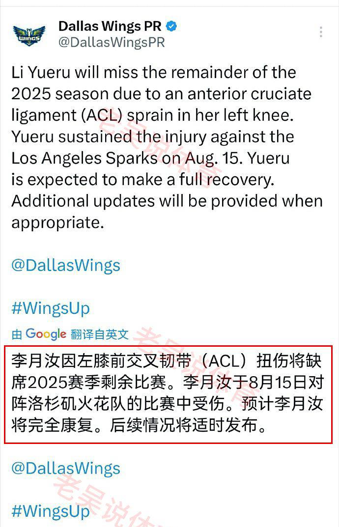 在飞翼对阵火花比赛中,李月汝在争抢球时不幸受伤,经检查发现膝盖旧伤复发,队医预计至少需要休息6周。由于WNBA赛程将于9月12日结束,这意味着李月汝本赛季将报销。