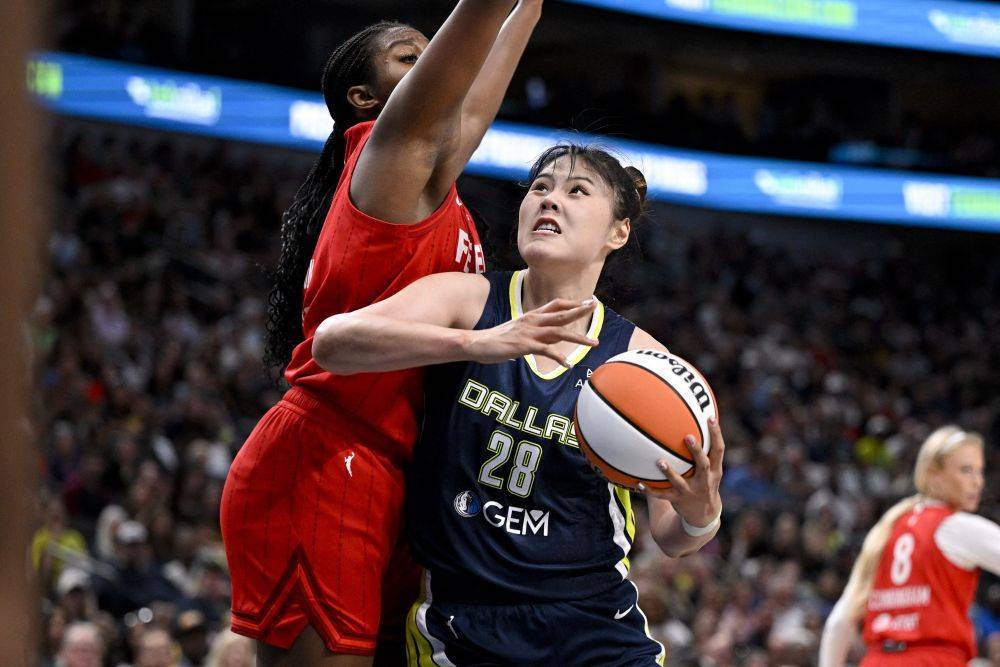 6月27日,达拉斯飞翼队球员李月汝(前右)在2025赛季美国女子职业篮球联赛(WNBA)常规赛中进攻。新华社/路透