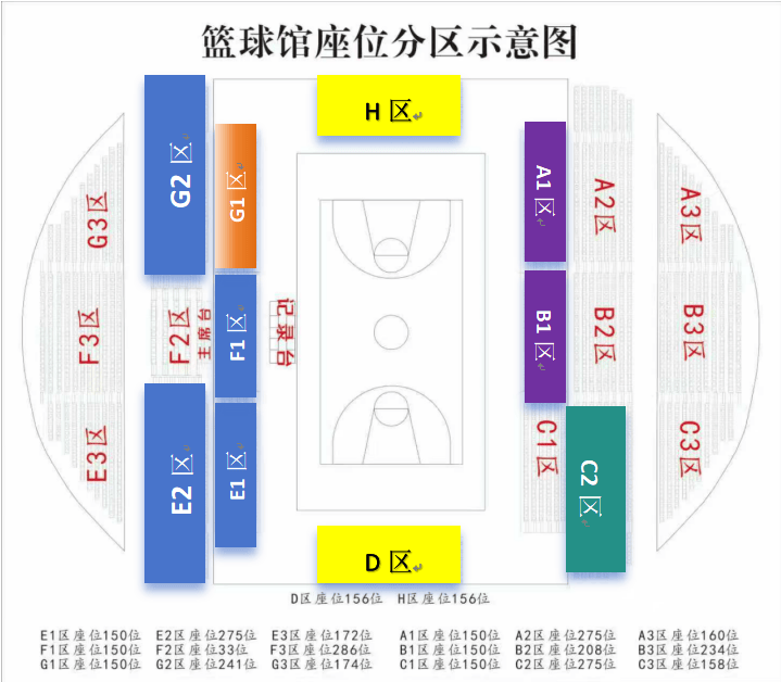 E1区(150个座位)、F1区(150个座位)、E2(275个座位)、G2(241个座位)为县各单位球迷区