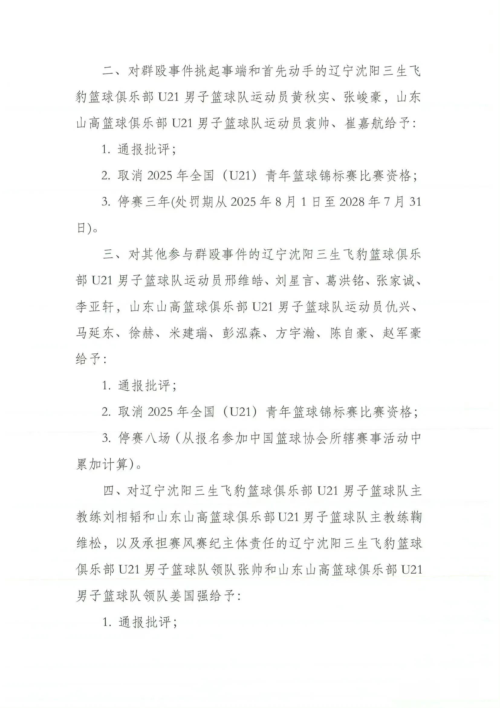 2025-09-02CBA,中国男子篮球职业联赛,CBA赛程,CBA直播,CBA比分,CBA投注/提供CBA最新赛程、实时比分、球队阵容、球员数据及盘口分析,服务中文球迷与篮球数据爱好者,让你全面掌握CBA最新动态。最新公布的处罚通知显示,U21赛场爆发大规模冲突后,四名核心球员被判停赛三年;辽宁队的黄秋实、张峻豪,以及山东队的袁帅、崔嘉航成为此次最受关注的对象。与此同时,两队其余13名球员、各自的教练和领队共4人,均被判停赛8场。再者,两队也被取消2025年U21比赛的参赛资格与成绩。