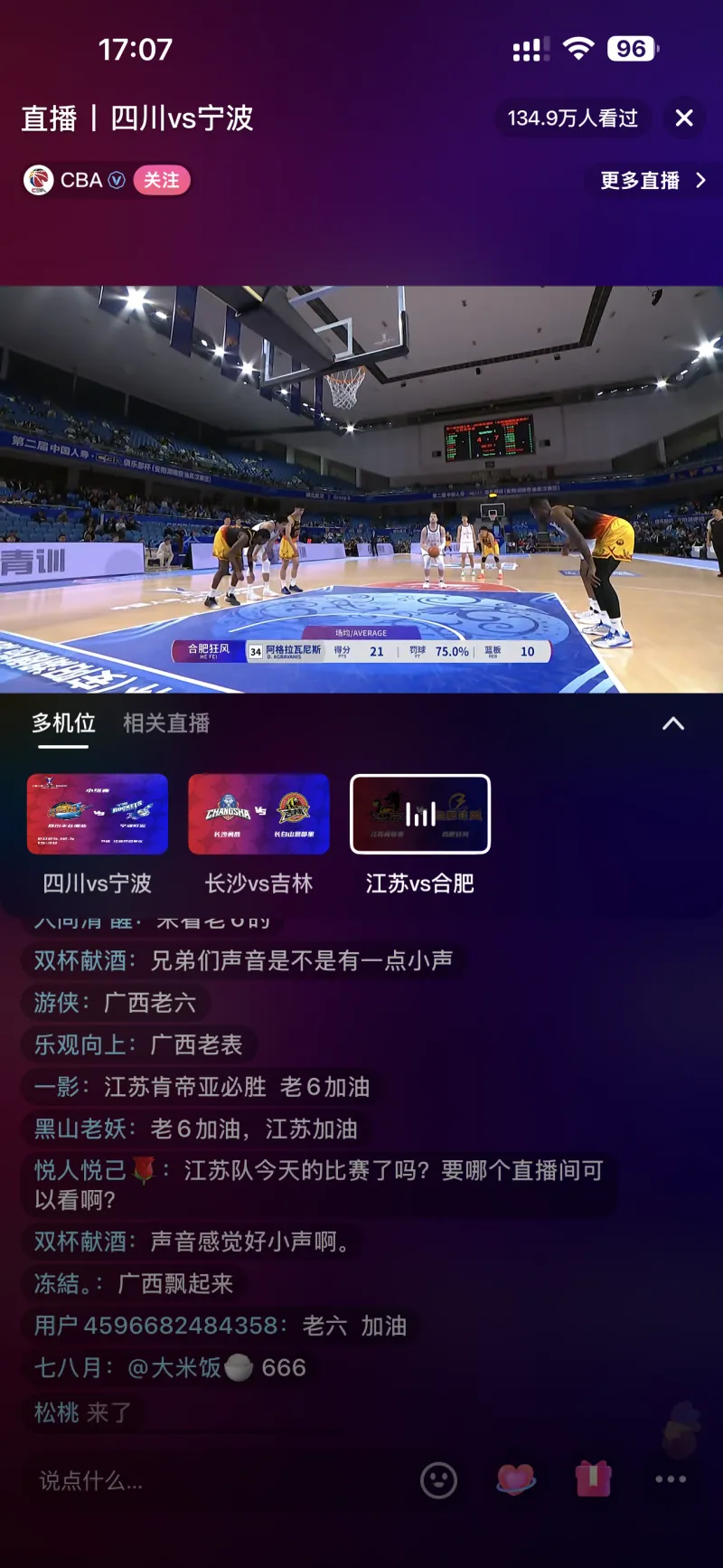 确实CBA放在抖音直播绝对是流量最大的,因为抖音比其他两个平台要方便很多评论的话也是实时的,就比如你刷的刷着着视频到比赛时间了直接打开就能看,而且最主要是免费可以看